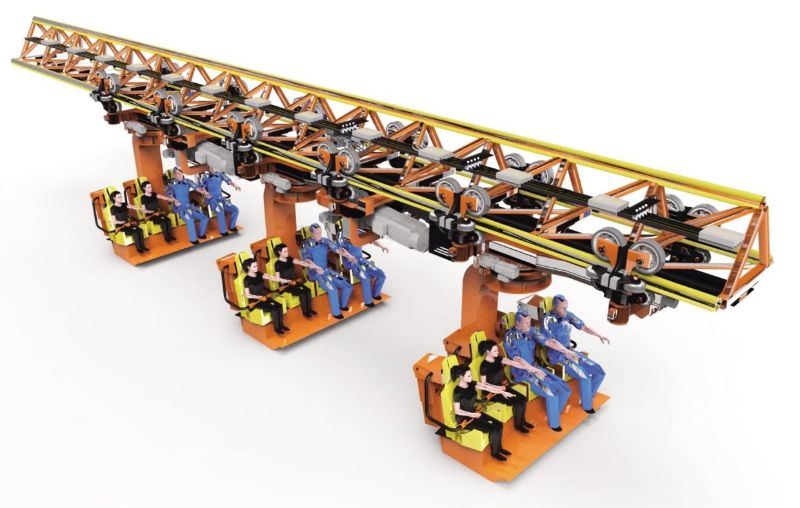 項目亮點:自驅(qū)懸掛式過山車采用多車同時在軌運行模式,通過直流滑線取電,列車速度全程可控,座椅懸掛于軌道下方,且可繞豎直軸旋轉(zhuǎn),能夠更好地與場景互動,特別適合家庭成員共同乘坐。